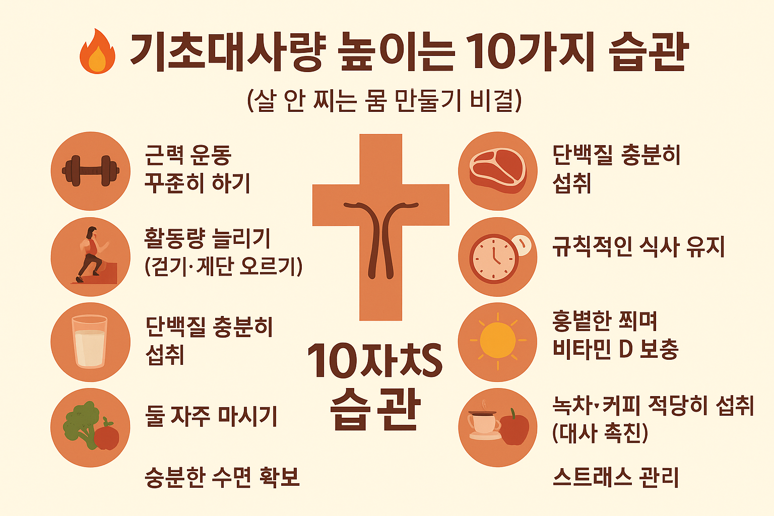 기초대사량 높이는 팁 10가지를 소개합니다. 살이 잘 찌지 않는 체질로 바꾸고 싶다면 오늘부터 실천 가능한 생활습관과 운동법을 확인해보세요.