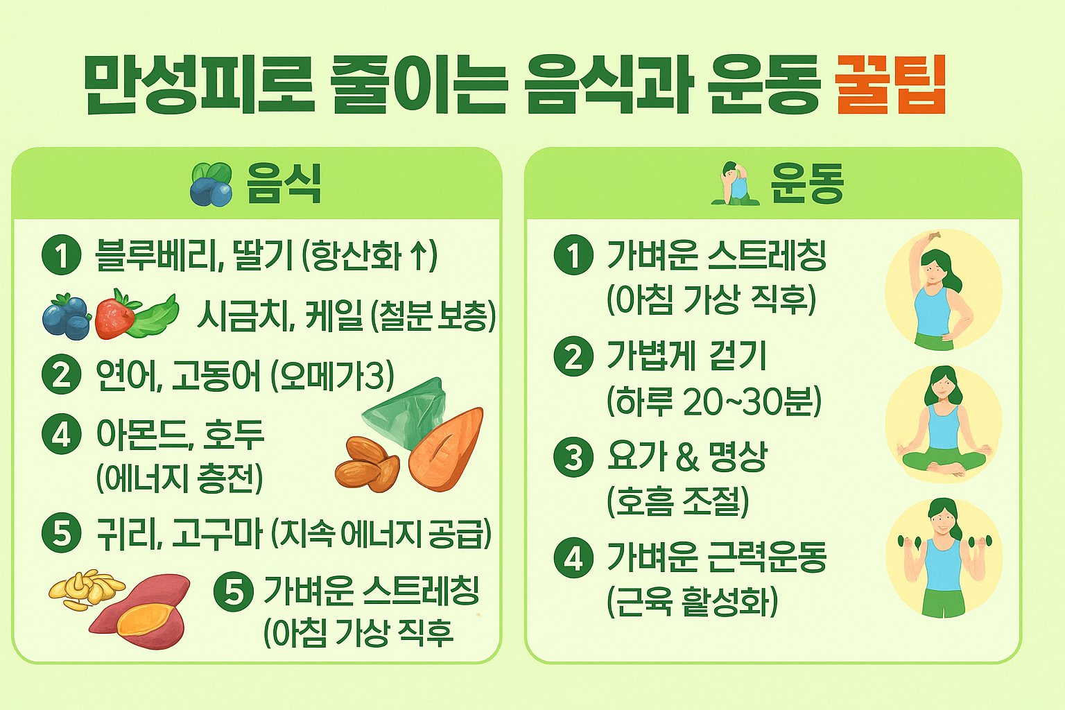 만성피로는 몸이 보내는 ‘쉼이 필요하다’는 신호입니다. 아무리 자도 나아지지 않는 피로감, 집중력 저하, 의욕 감소… 이런 일상 속 고민들이 반복된다면 음식과 운동을 바꾸는 것으로 해결 실마리가 될 수 있다는 점, 알고 계셨나요? 오늘은 ‘만성피로 줄이는 음식과 운동 꿀팁’이라는 키워드로 생활 속에서 쉽게 실천 가능한 방법을 정리했습니다. 맛있는 음식과 무리 없는 운동으로 피로를 가볍게 날려보는 건 어떠세요?