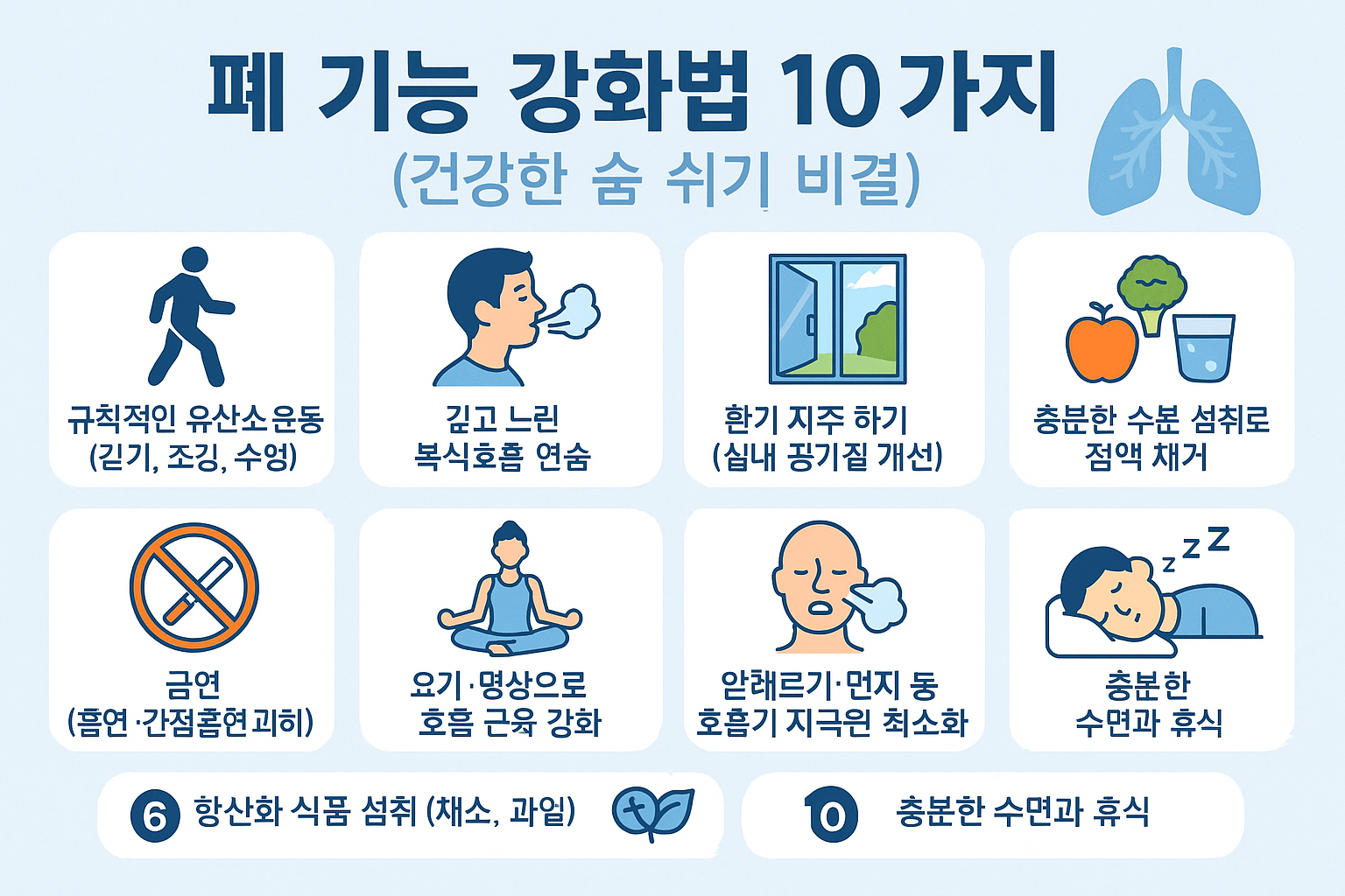폐 기능 강화법 10가지를 통해 호흡기 건강을 지킬 수 있습니다. 숨 쉬는 것이 편해지면 삶의 질도 달라집니다. 지금부터 쉽게 실천 가능한 방법들을 소개합니다.